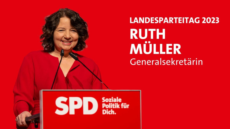 Generalsekretärin der BayernSPD, Ruth Müller, mit ihrer Rede anlässlich des 74. Ordentlichen Landesparteitags im Kongress am Park in Augsburg am 13. und 14. Mai 2023.